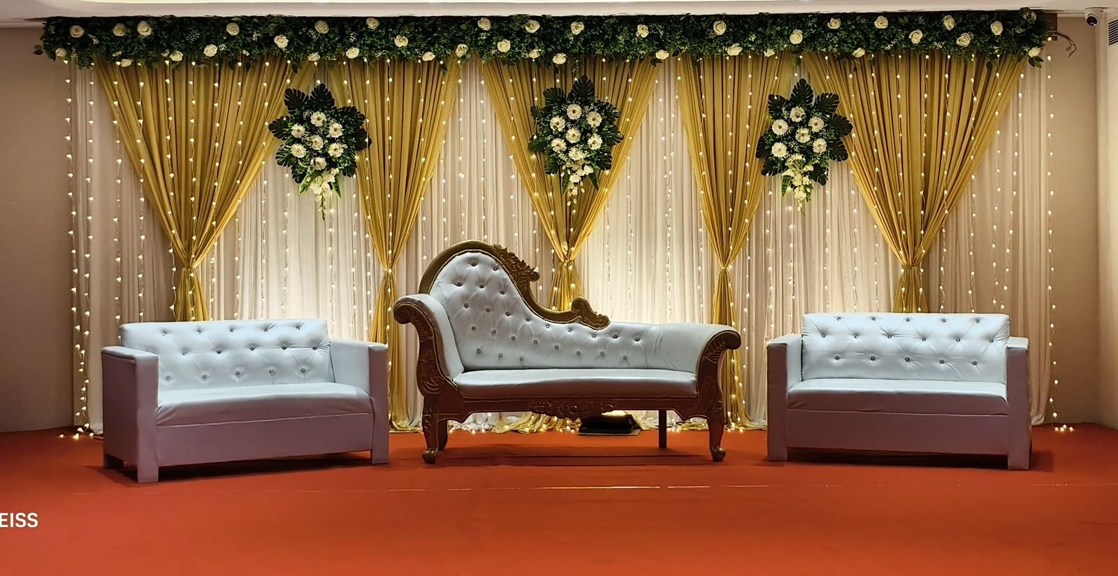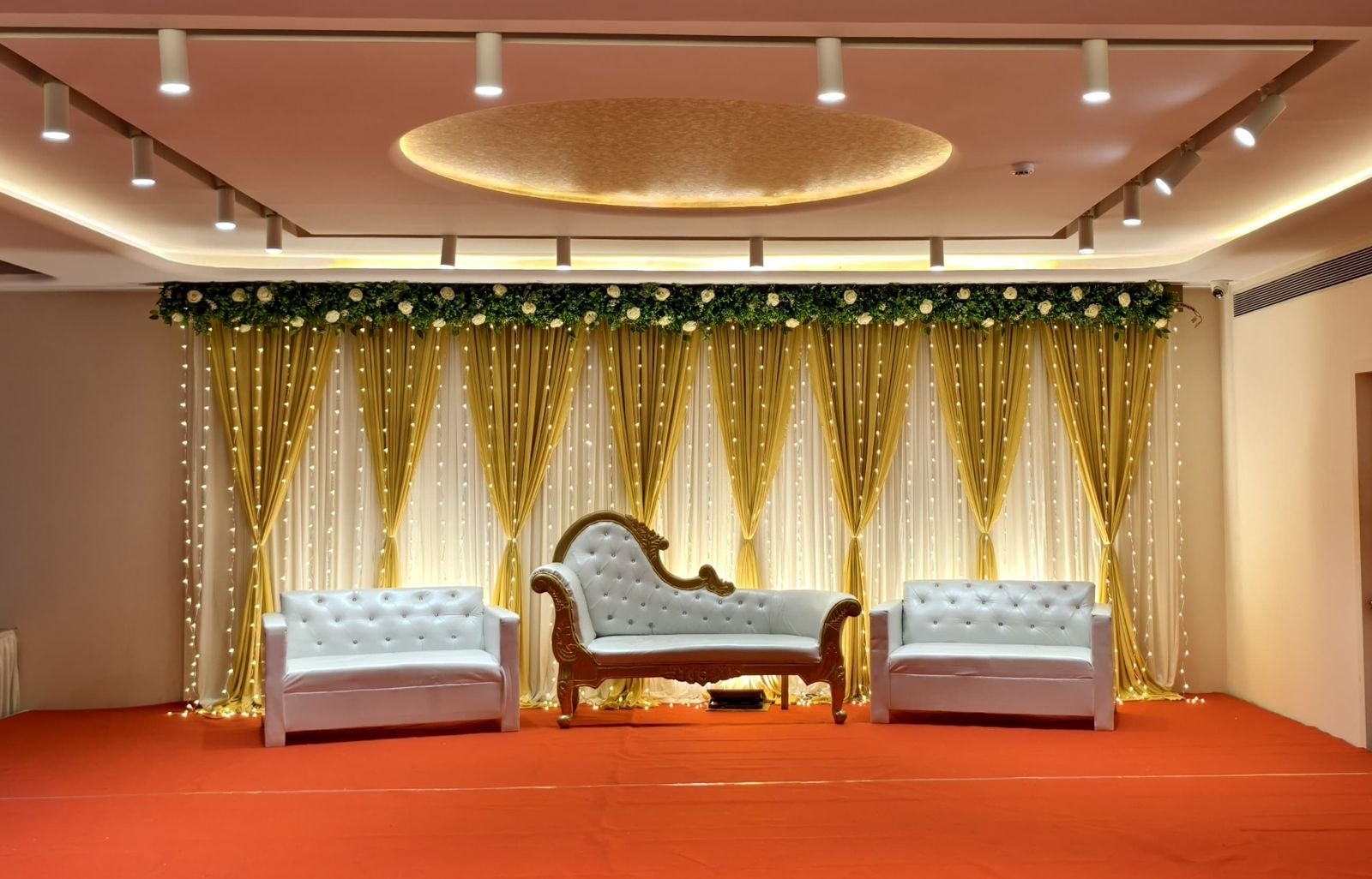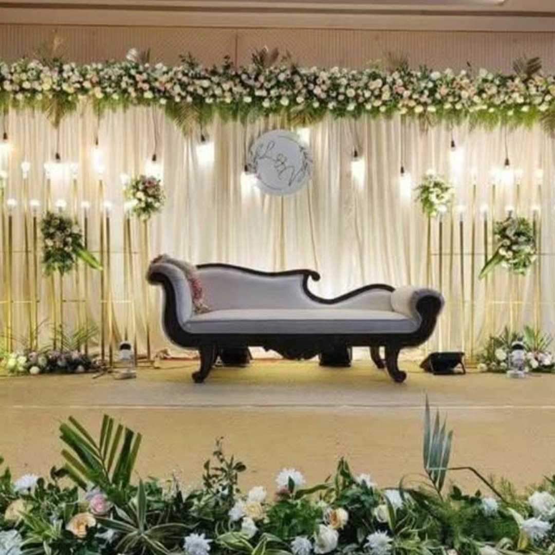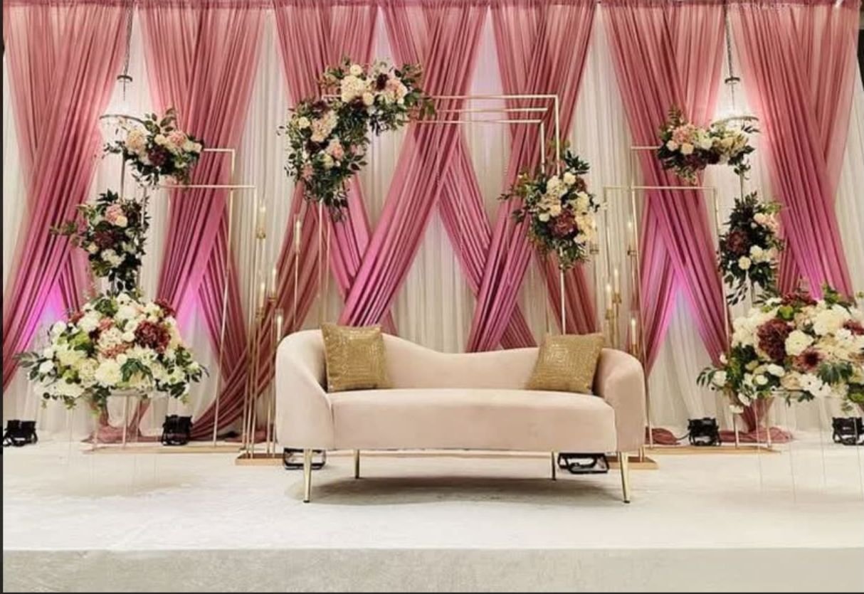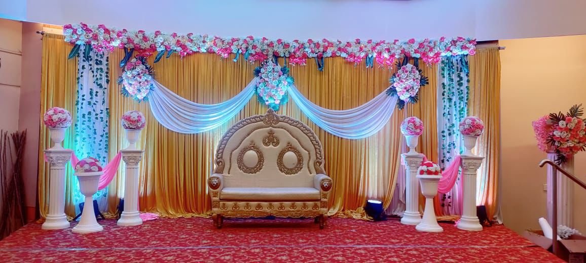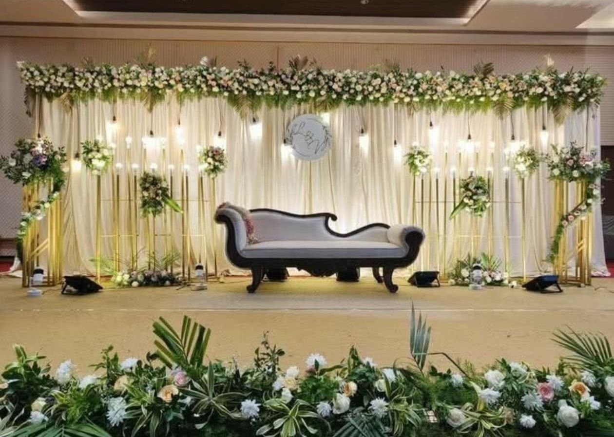 Decorate a banquet hall with floral arches, red carpets, and themed drapes. Use chandeliers, string lights, and backdrops for ambiance. Enhance tables with centerpieces, runners, and elegant seating. Highlight stages with LED screens, floral accents, and throne chairs. Add spotlights, candles, fog effects, and themed décor for a stunning atmosphere.