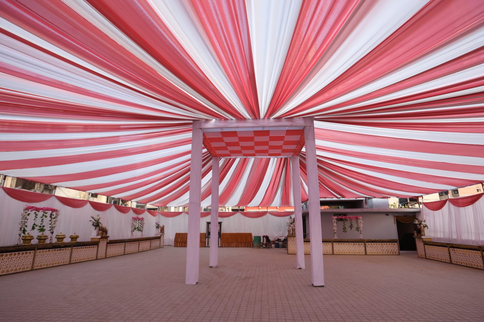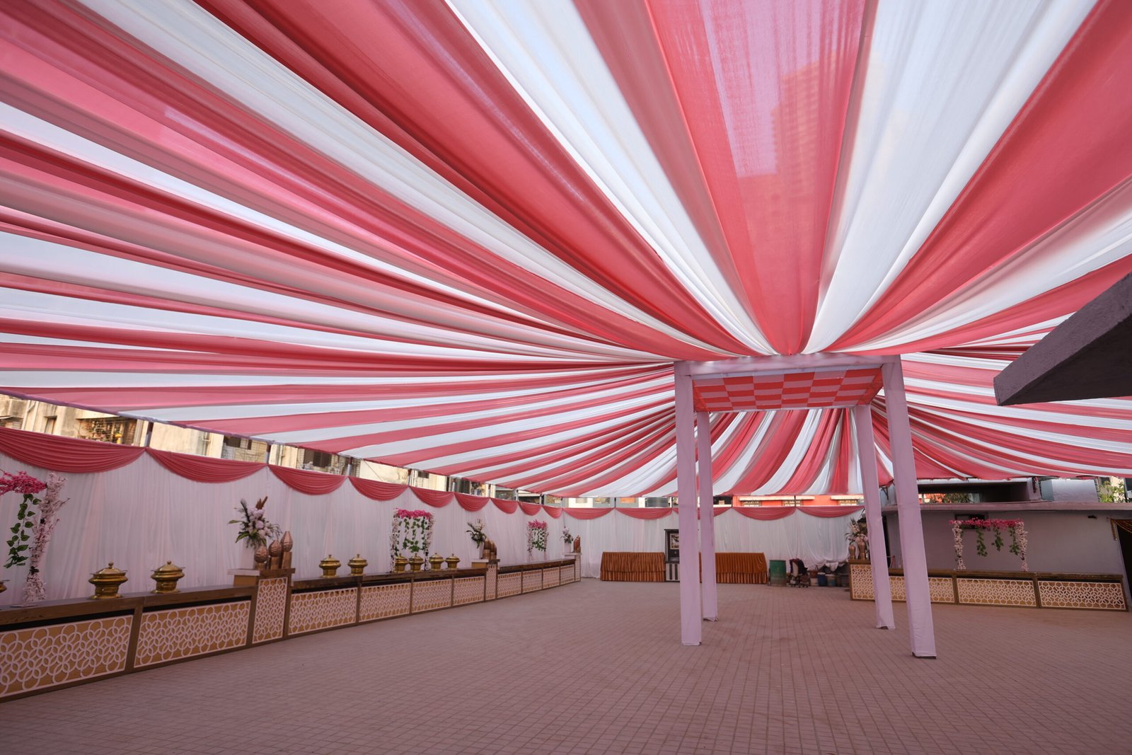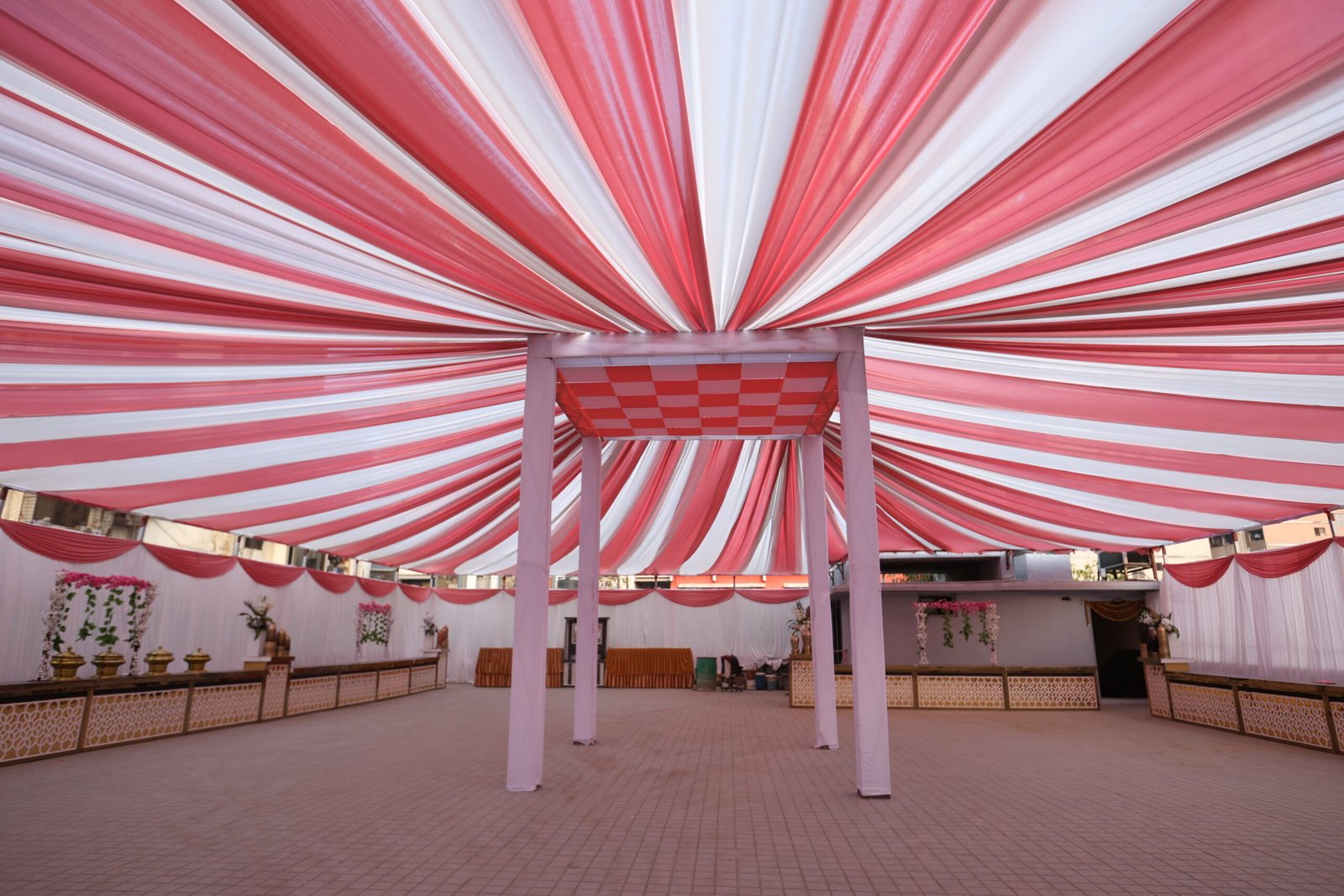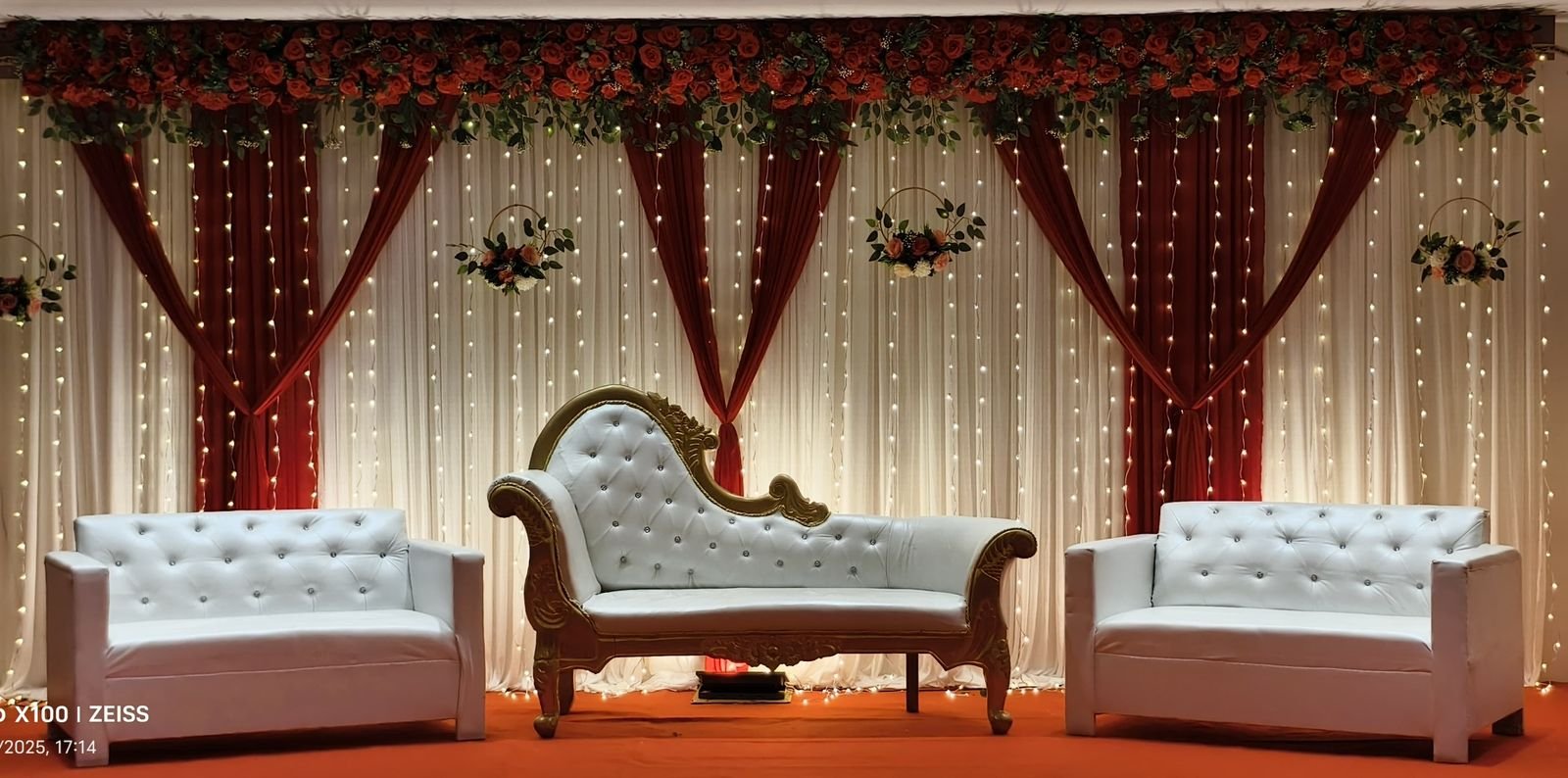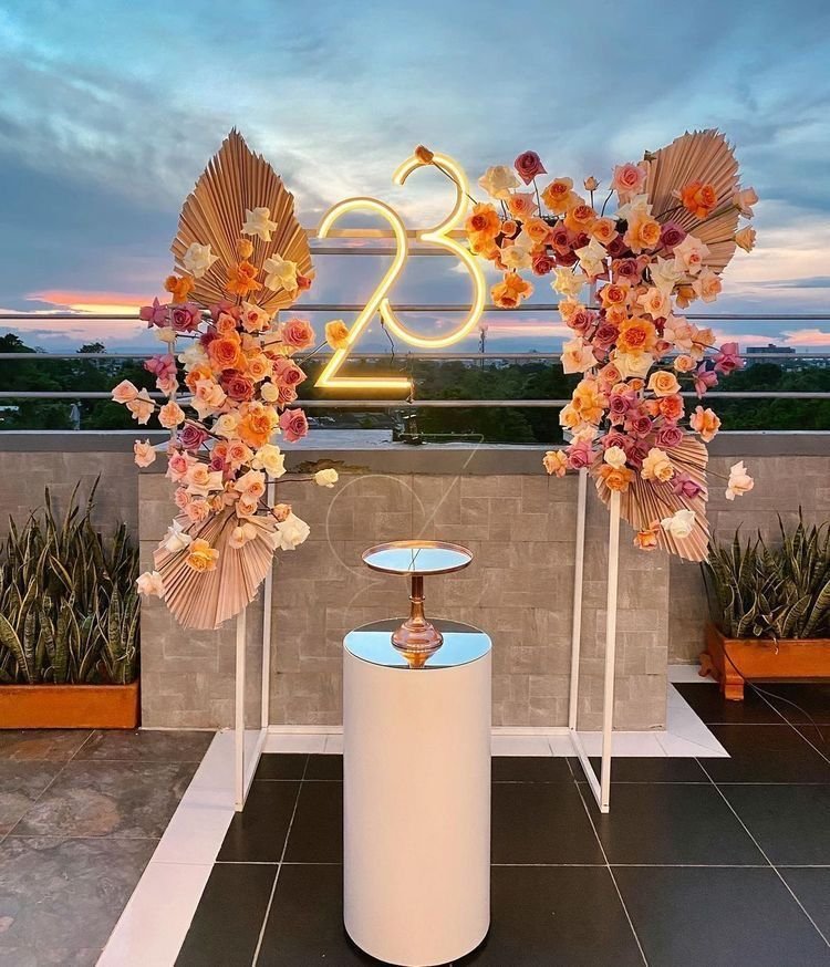 Decorate a banquet hall with floral arches, red carpets, and themed drapes. Use chandeliers, string lights, and backdrops for ambiance. Enhance tables with centerpieces, runners, and elegant seating. Highlight stages with LED screens, floral accents, and throne chairs. Add spotlights, candles, fog effects, and themed décor for a stunning atmosphere.